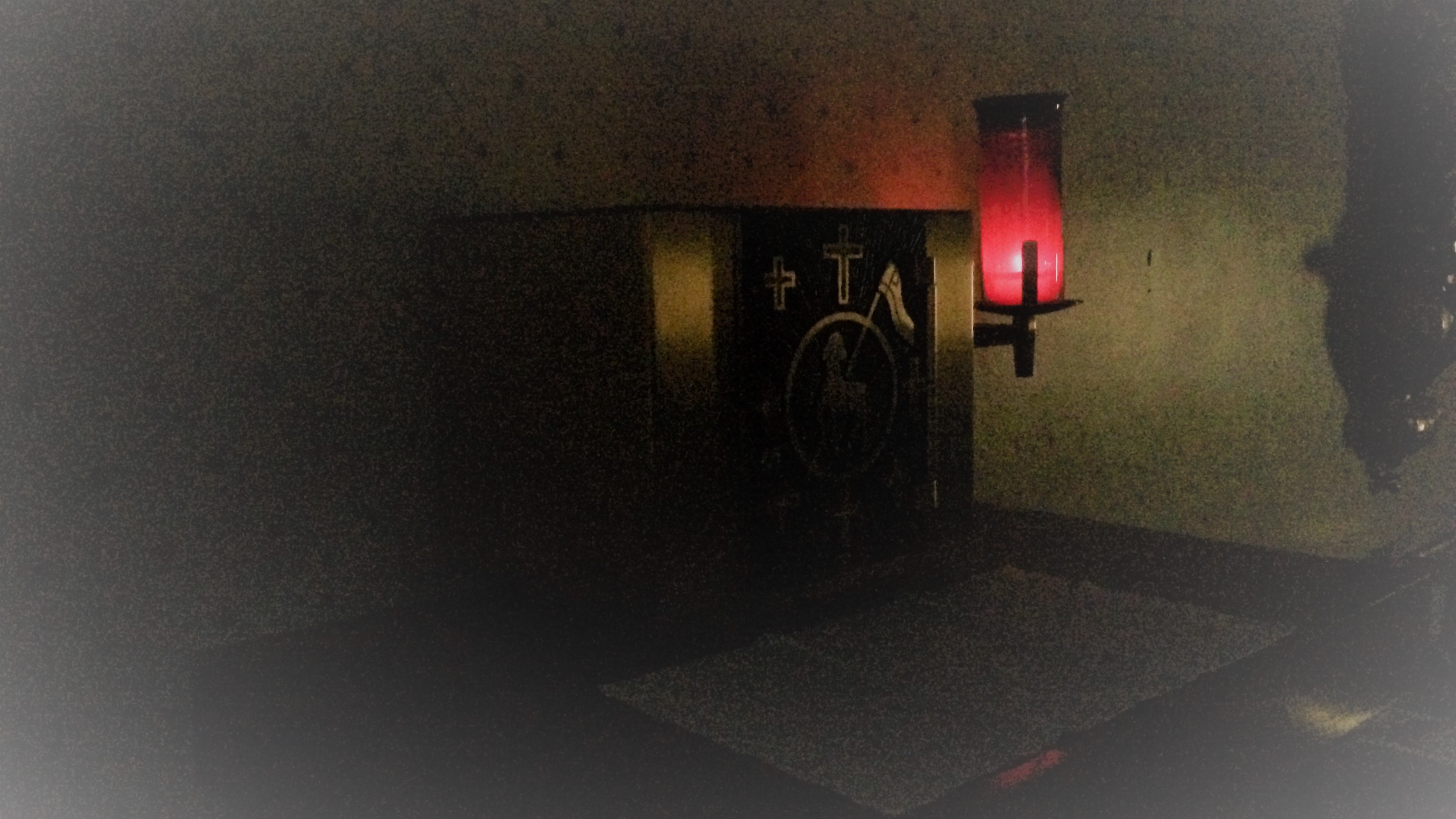 Photo: tabernacle and sanctuary lamp in the chapel at Cardinal Newman, before the dawn