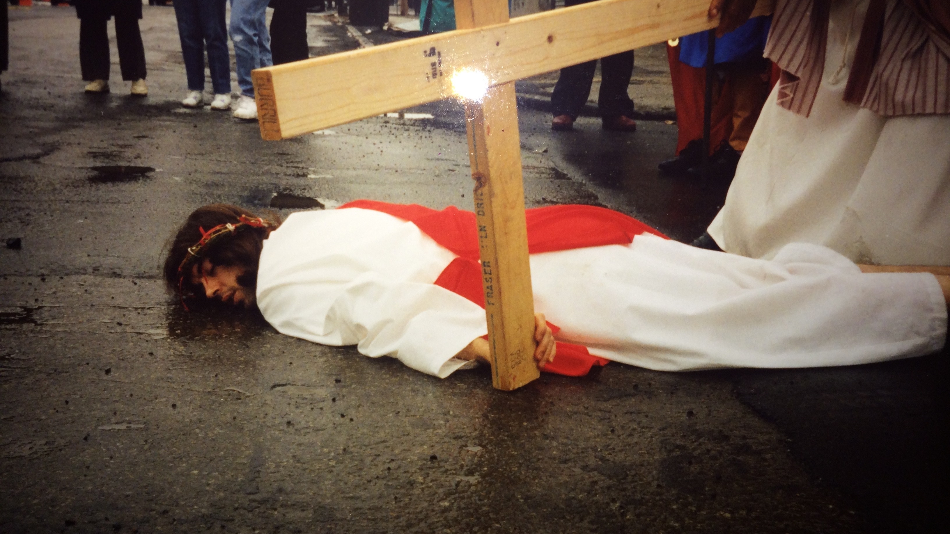Photo: Me, as Jesus in the Living Stations, Jesus falls the third time, Good Friday around 1991 in the streets of the Bronx