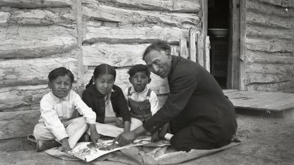 Photo: Source Marquette University Catholic Mission Archives. Nicholas Black Elk catechizing with the “Two Roads Map” at the cabin of Broken Nose, Pine Ridge Reservation.
