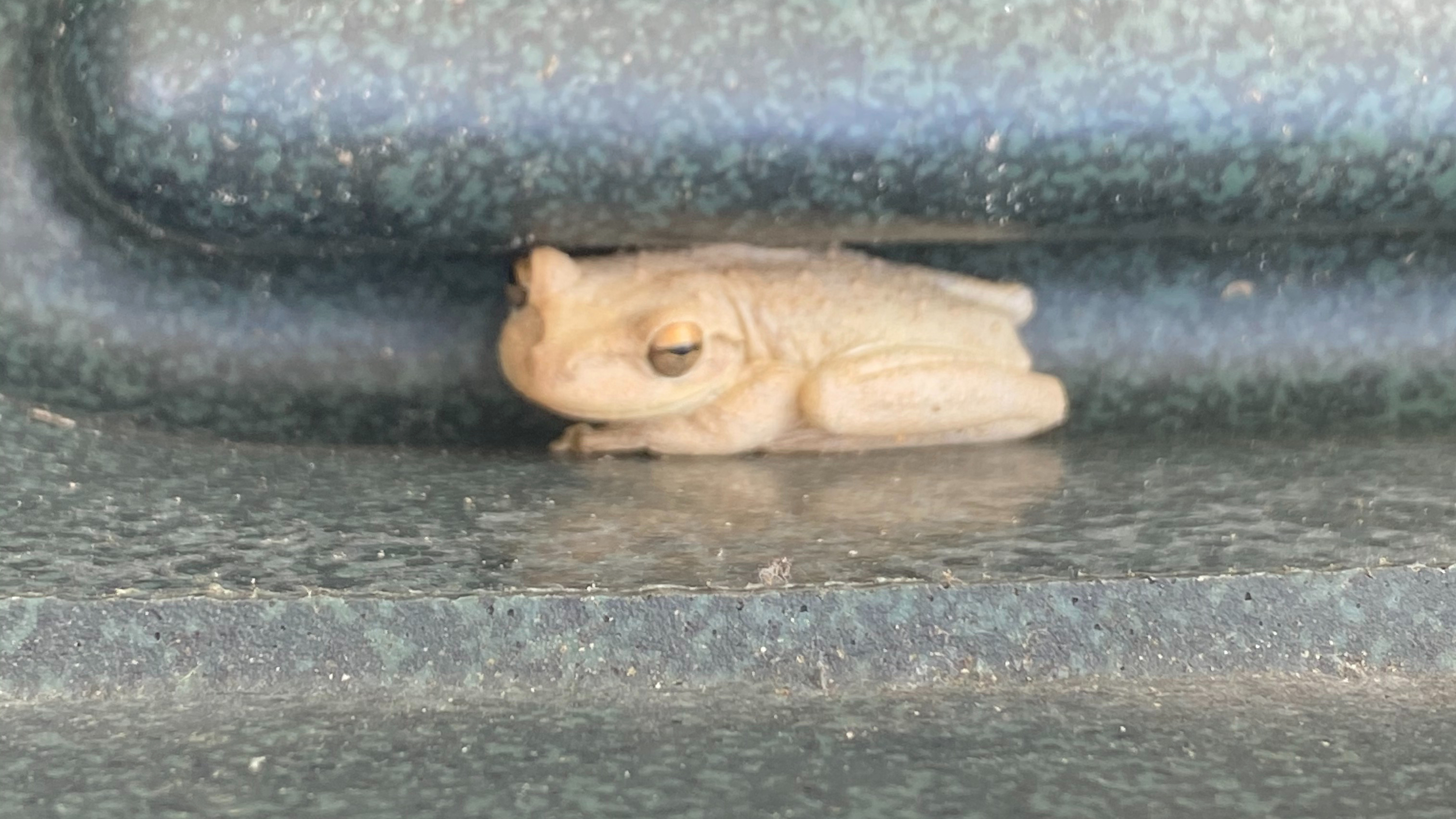 Photo: Tree frog that has found comfort in my trashcan for the past few weeks. Interesting…