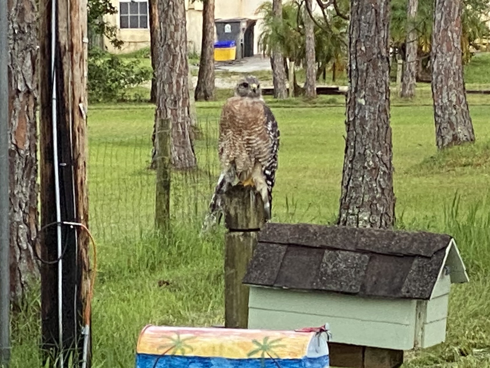 Photo: I am thankful for the walks JoAnn and I used to take together, and look forward to evening walks again soon to see friends such as this red shouldered hawk drying out after a rain. What are you thankful to God for?