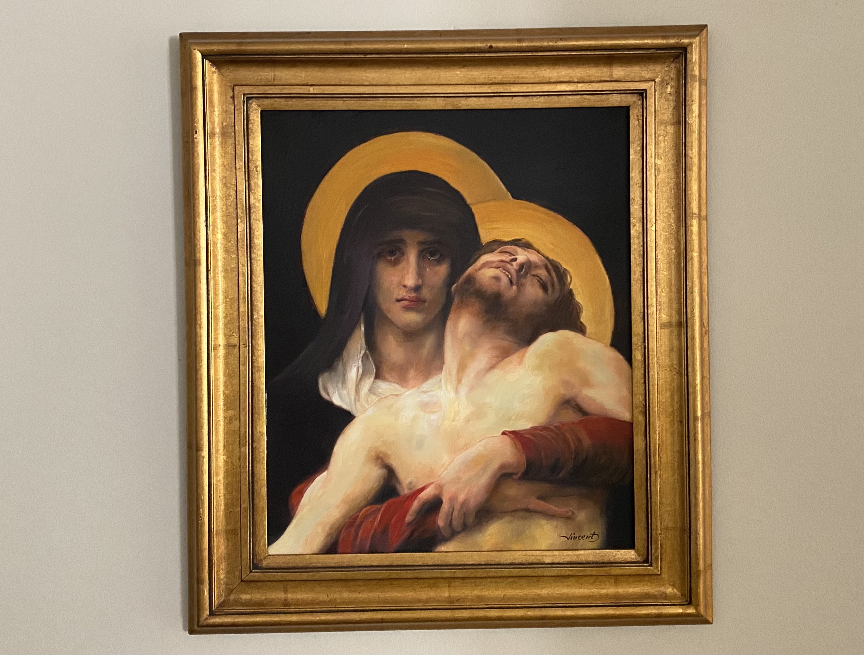 Photo of a closeup painting of William Bouguereau’s, Pieta, hanging in the main conference room at the Our Lady of Florida Retreat Center, North Palm Beach, FL.