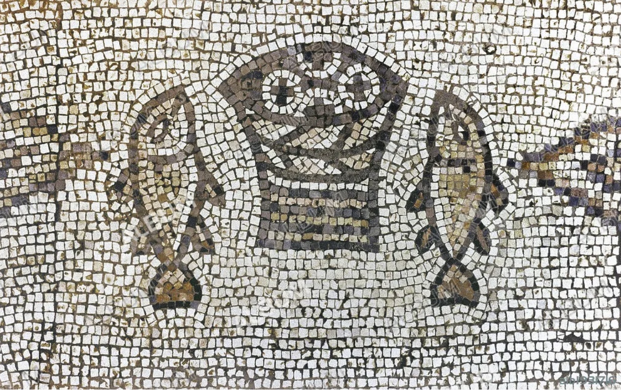 Photo: Mosaic of fish and basket with bread present at the foot of the altar in the Church of the Multiplication of Loaves and Fishes, at Tabgha, Galilee, Israel.