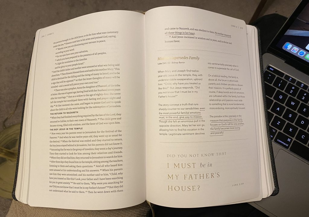 Photo: Making some time to study in the School of Nazareth, by pondering the Gospel of Luke in the Word On Fire Bible: The Gospels.