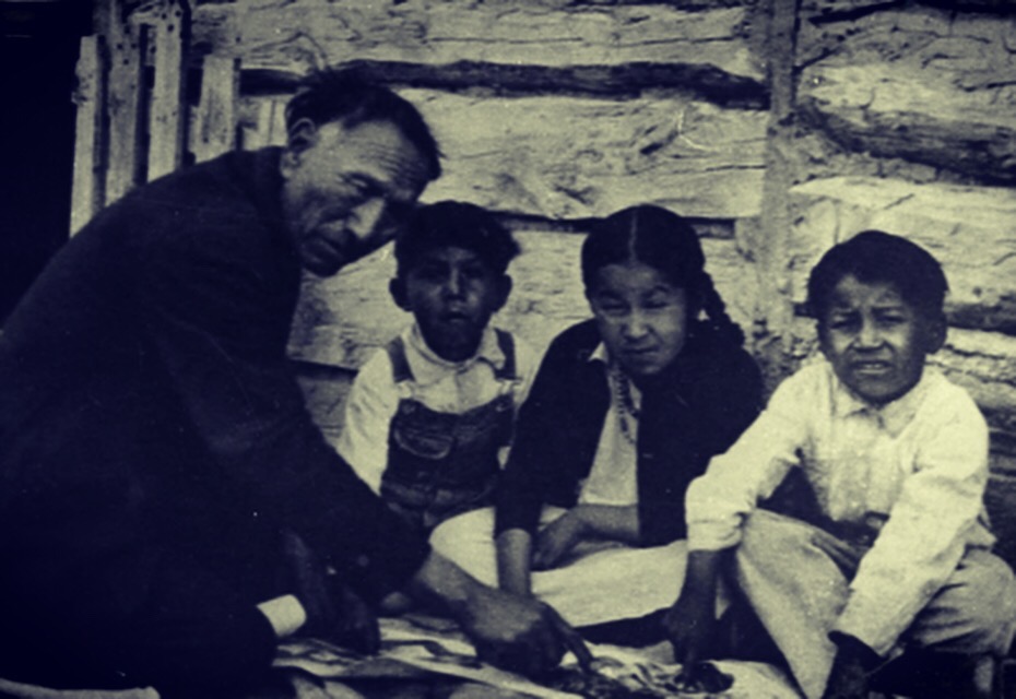 Photo: Source Marquette University Catholic Mission Archives. Nicholas Black Elk catechizing with the “Two Roads Map” at the cabin of Broken Nose, Pine Ridge Reservation.