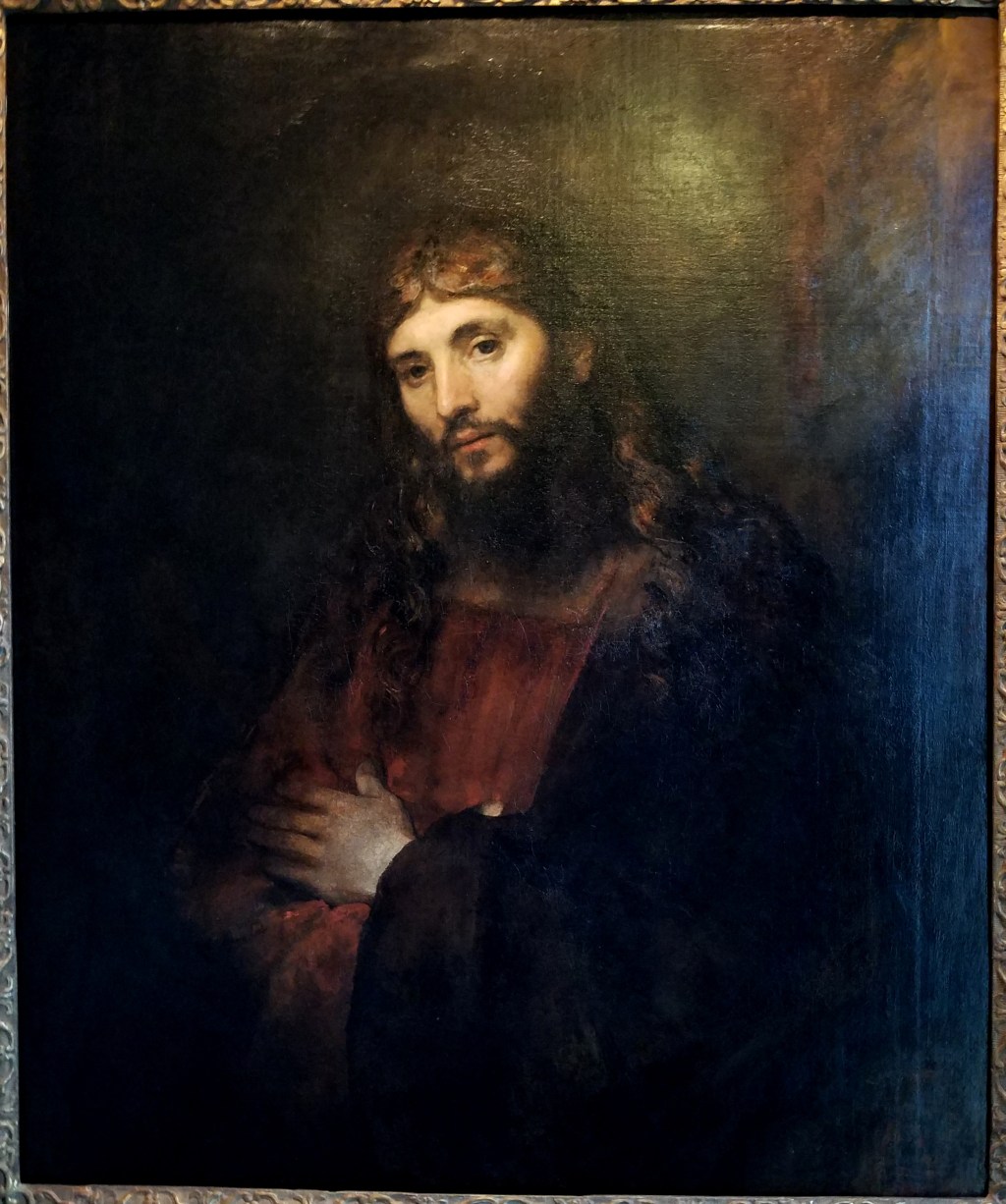 Painting: Head view of Rembrandt’s Christ with Arms Folded.