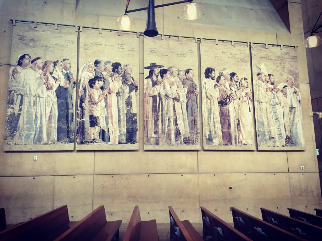 Photo: Tapestry hanging in the sanctuary of the Cathedral of Our Lady of the Angels, Los Angeles, CA. Some of the saints who practiced their part in God’s theodrama and are now with God in heaven.