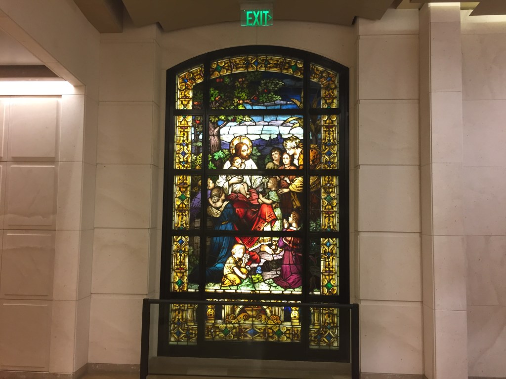 Photo: A stained glass image of Jesus with children at Our Lady of the Angels Cathedral, Los Angeles, CA.