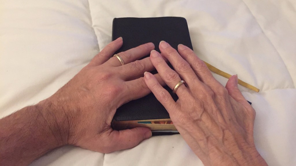 Photo: JoAnn and my hand on my breviary. We dedicated our lives to God and each other, and on the inside of each of our rings is etched the word eternally.