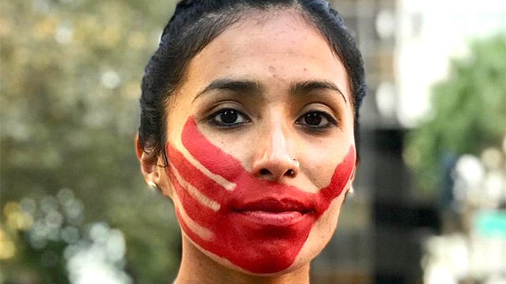 Photo: Jordan Marie Brings Three White Horses Daniel of the Lower Brule Sioux runs many races including the 2019 Boston Marathon to bring awareness to the issue of MMIW – Missing and Murdered Indigenous Women. She wears the red hand symbol of the movement which stands for, “We will not be silenced.” (photo – Devin Whetsone)