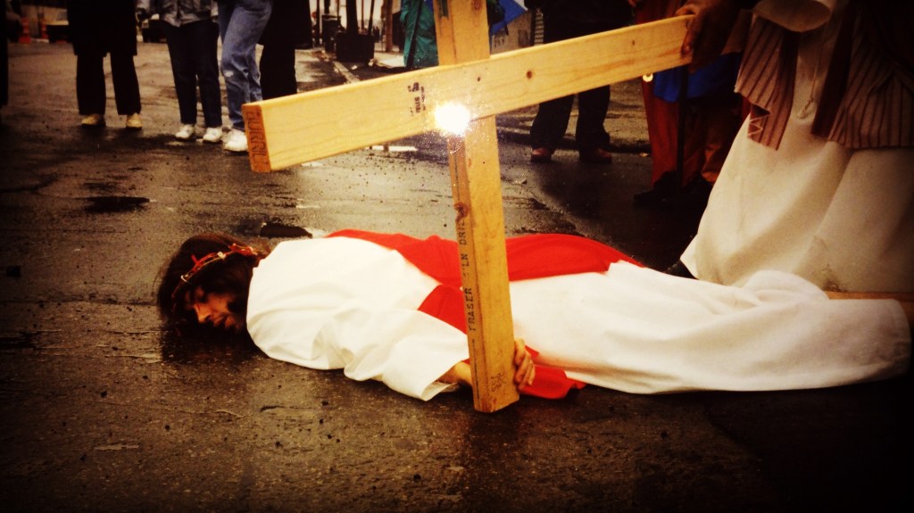 Photo: Me, as Jesus in the Living Stations, falling the third time, Good Friday around 1991 in the streets of the Bronx