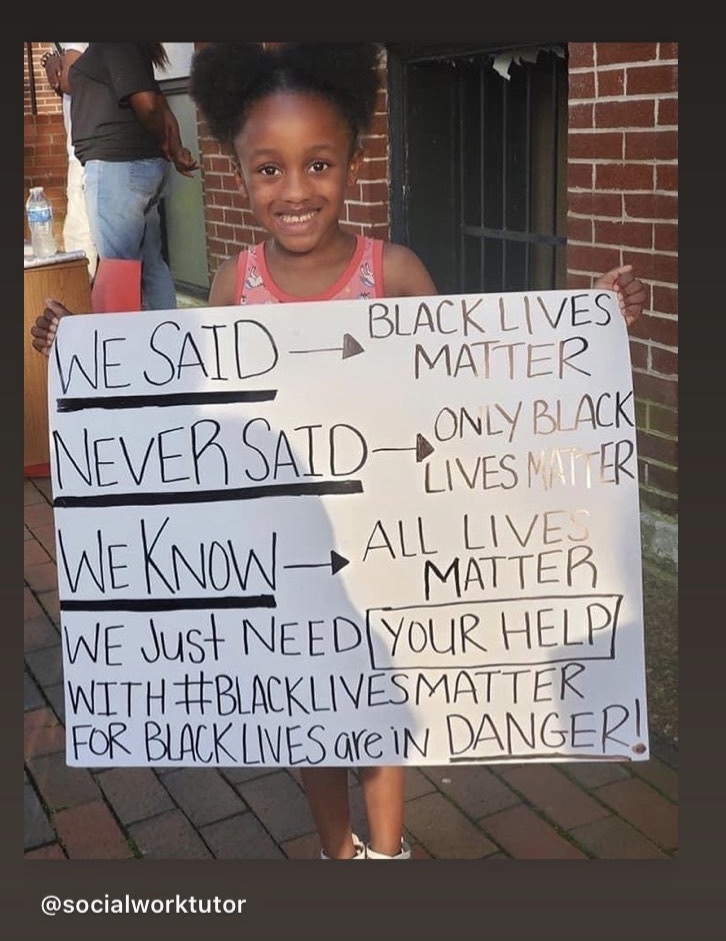Photo: @socialworktutor Helps to explain those who misunderstand the purpose of the phrase Black Lives Matter. The sign reads: We said – Black Lives Matter – Never Said – Only Black Lives Matter – We Know – All lives matter – We just need your help with #BlackLivesMatter for black lives are in danger. Being willing to understand another’s point of view is an important first step.