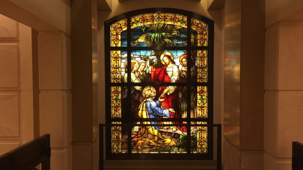 Photo: Peter receiving the keys of the kingdom. As Peter was commissioned the Gospel so are we. Stained glass in Cathedral of Our Lady of the Angels, Los Angeles, CA,