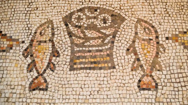 Image from loaves and fish mosaic found in the Church of the Multiplication in Tabgha, Israel on the northwest shore along the Sea of Galilee. Picture from link: