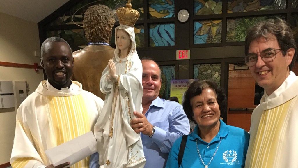 Last night we experienced a beautiful Mass commemorating the 100th anniversary of Mary’s appearance to the three shepherd children at Fatima, Portugal. Did we process in with a statue of Our Lady of Fatima, yes, and was the statue given a place of honor yes. But the focal point, the ultimate procession was of those coming toward the altar, affirming their commitment to serving Jesus, by receiving him in his Real Presence in the Eucharist. Mary brought us out on a Friday night, away from our tv’s, cell phones, iPads, restaurants, and also from our trials, challenges, and weariness, to celebrate a bilingual Mass, the rich diversity of our parish, the coming together as a community for the sole purpose of worshipping her Son. Nourished then by Jesus through his presence in our communal gathering, his Word, and his Body and Blood, we were then sent forth to be his disciples and radiate his light to those we meet.