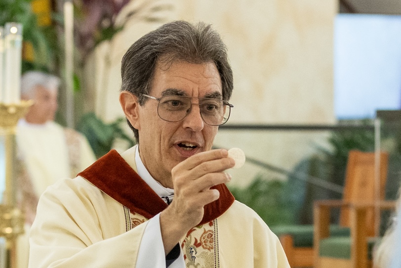 Photo: First time as a priest sharing the Body and Blood of Christ who is present in each consecrated host: First Mass of Thanksgiving, May 4, 2024, St. Peter Catholic Church, Jupiter, FL.