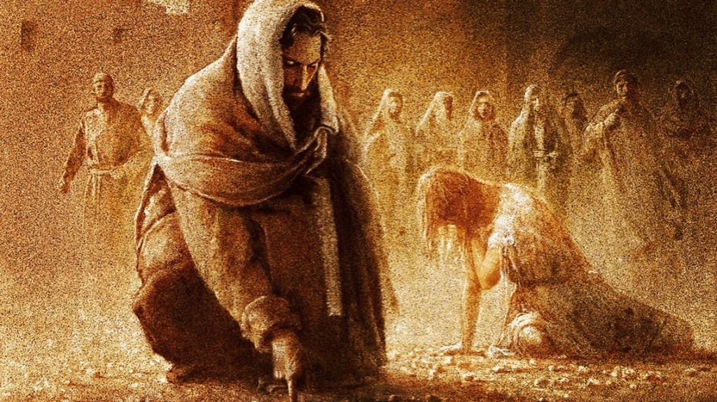 Painting: “Forgiven” by Yongsung Kim, Jesus showing his moral courage in standing up for the woman caught in adultery.
