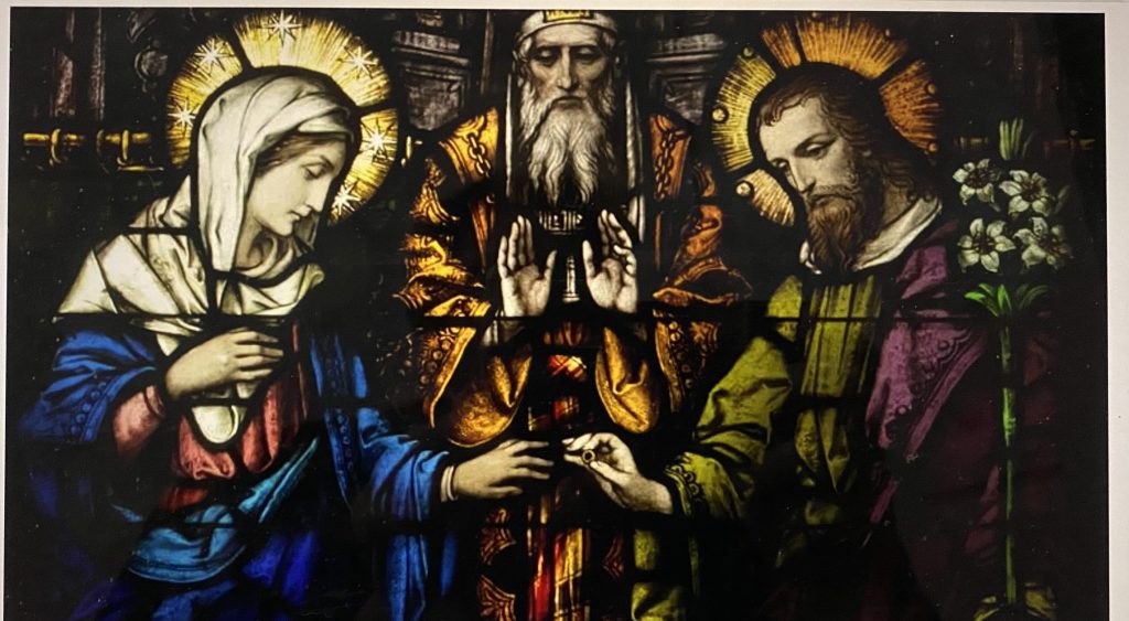 Photo: Stained glass window of the betrothal of Joseph and Mary, from the Church of the Immaculate Conception in Connellsville, PA by Nancy Bauer.