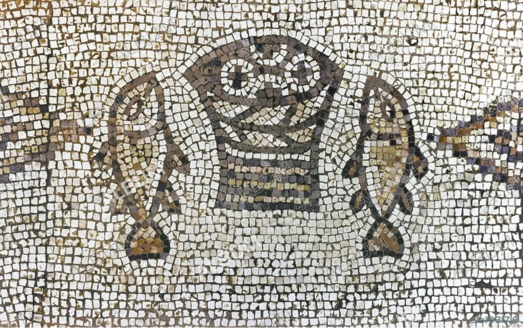 Photo: Mosaic of fish and basket with bread present at the foot of the altar in the Church of the Multiplication of Loaves and Fishes, at Tabgha, Galilee, Israel.
