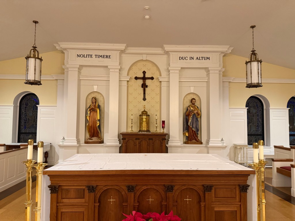 Photo: Seminarian chapel at Mundelein Seminary. Latin on the left – Nolite Timere: Be not afraid and on the right – Duc In Altum: Into the Deep. As disciples we are not to be afraid and we are to go into the deep just as Peter and the Apostles did.